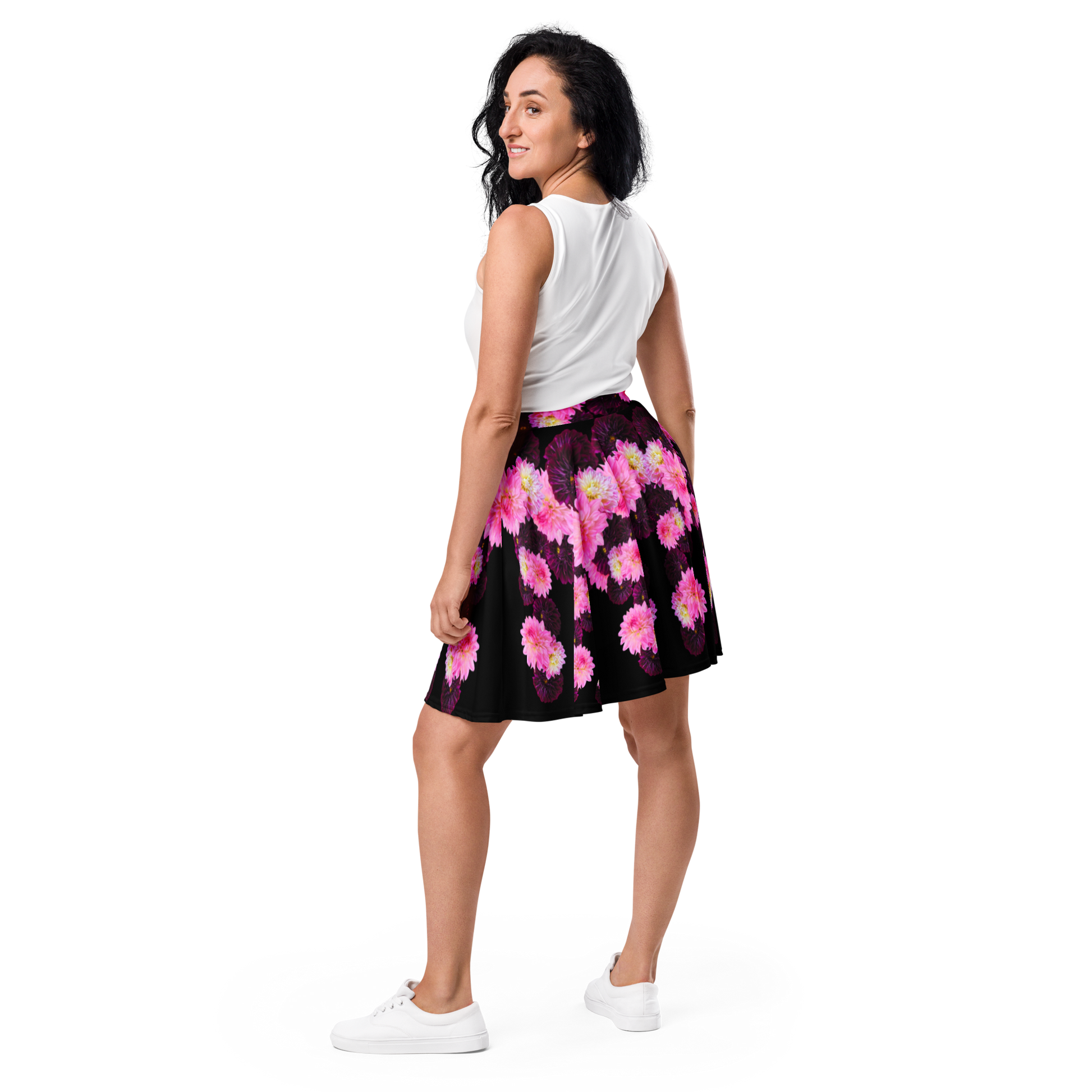 Add a touch of mystery and elegance to your wardrobe with this stunning A-line skater skirt featuring a dramatic black background adorned with a vibrant collage of purple and pink dahlias from my personal photographs. The unique floral design creates a striking visual effect, making this skirt perfect for anyone who loves bold, artistic fashion. Digitally designed with love, it's a must-have for those who appreciate unique, nature-inspired designs.