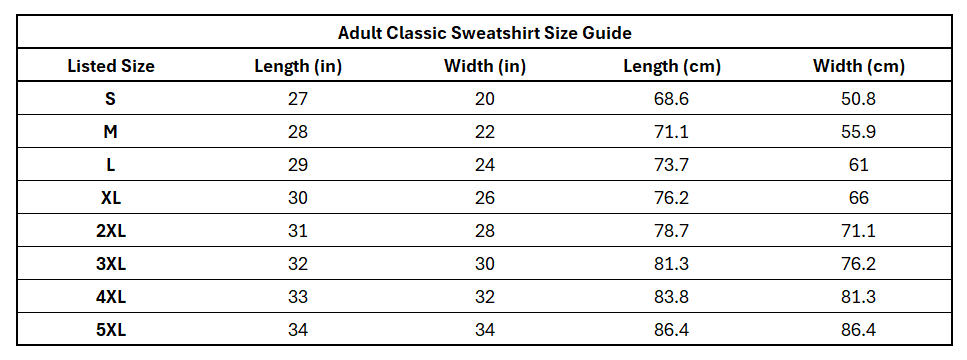 | Adult Gildan 18000 Sweatshirt Size Guide | ||||
