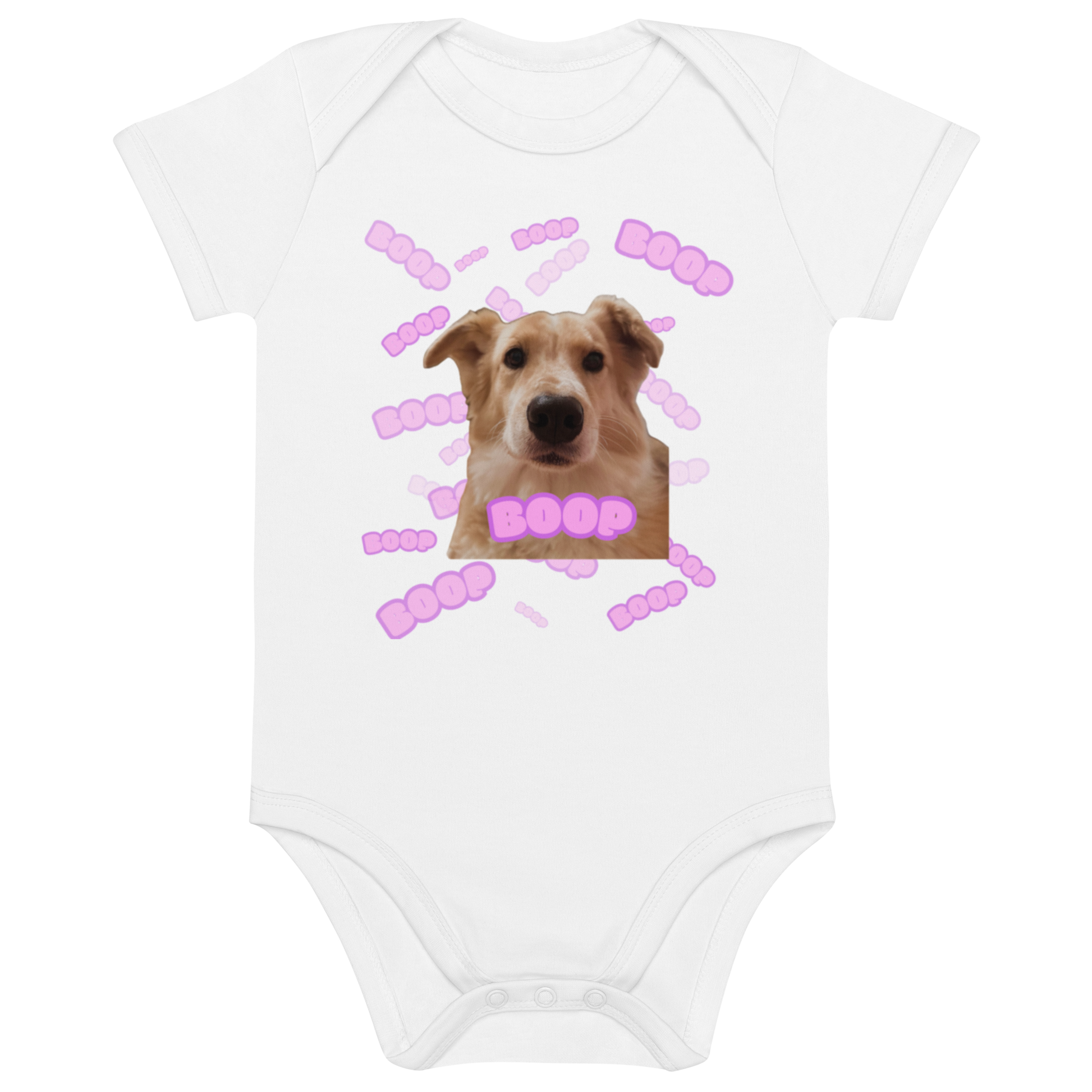 This adorable baby bodysuit features the Fee Boop™ graphic, with Fee's nose front and center and the word "Boop" all over the background. Perfect for baby's first giggles, cuddles, and of course… boops!
