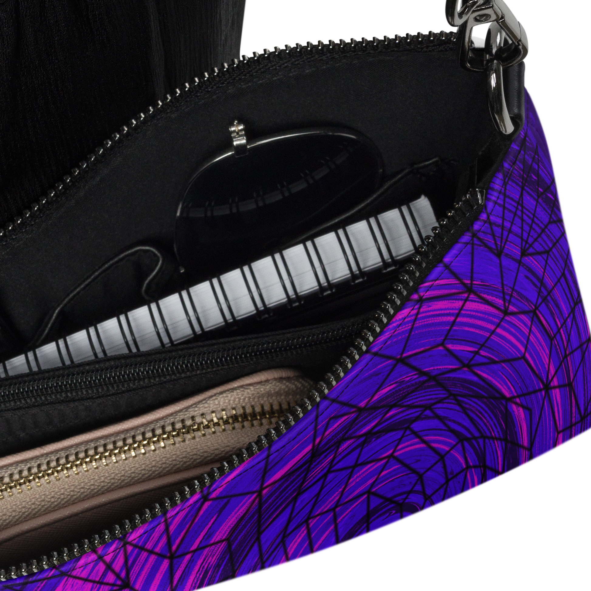 Try out a new look with this bold faux leather Feespirations Geo™ crossbody shoulder bag, featuring a beautiful and colorful psychedelic swirl combined with a geometric crystal dreamcatcher pattern inspired by my hand-designed coloring book "Mosaic Masterpieces: Volume 1". Perfect streetwear for everyday wear or nights on the town, this bag adds a subtle statement to any outfit. With a zip-top closure and multiple inside pockets, you can keep your essentials secure and organized.