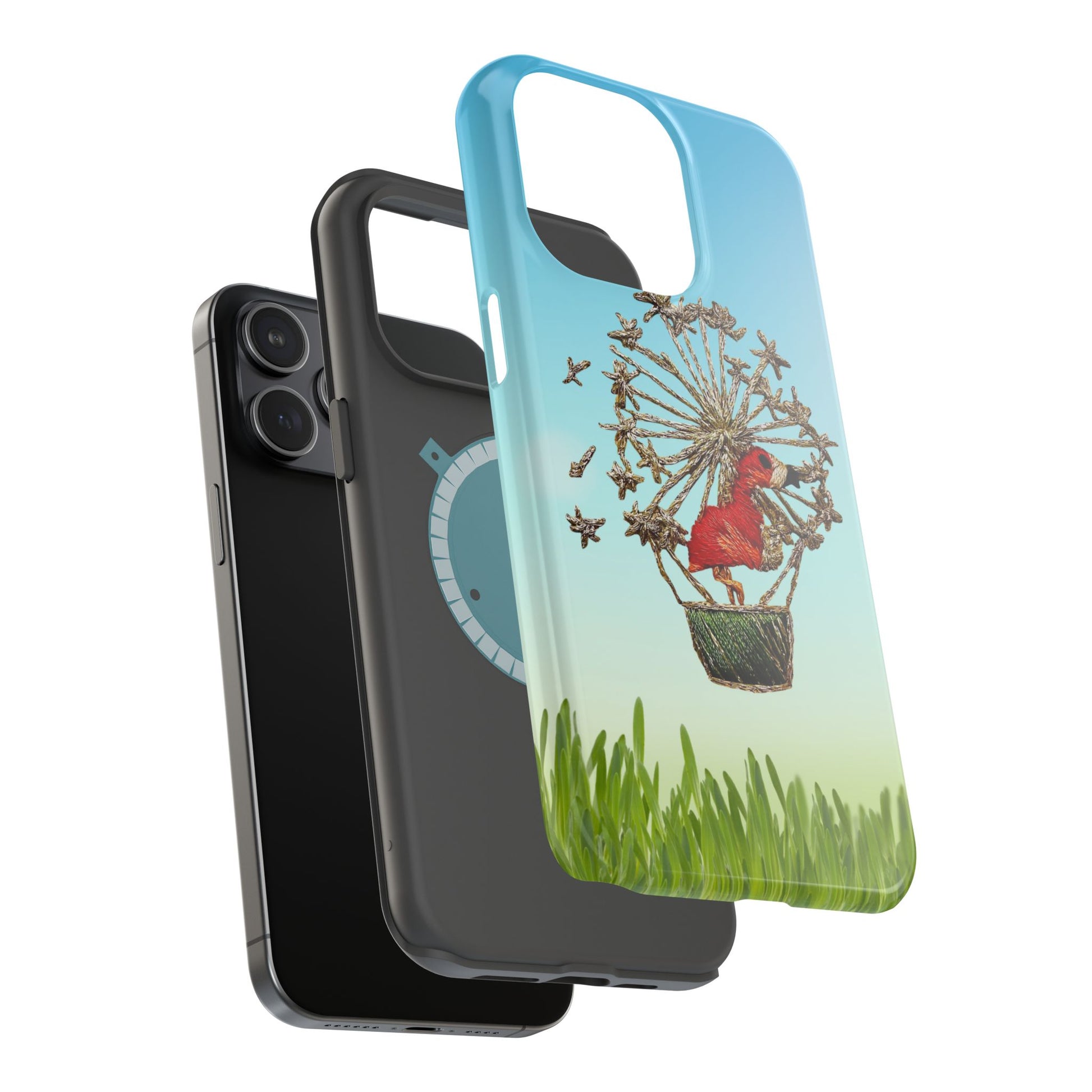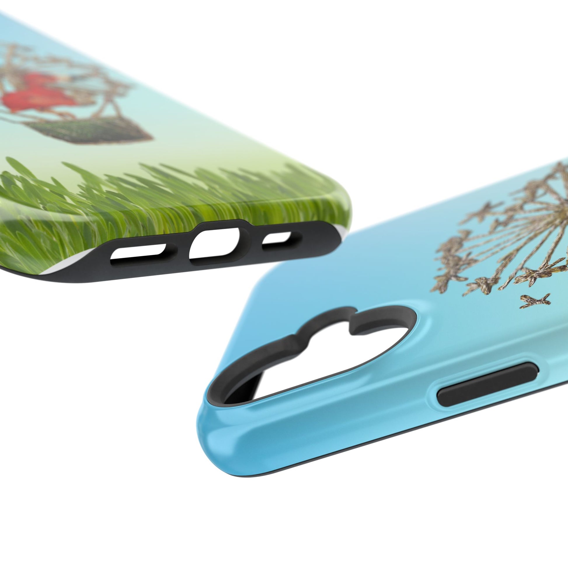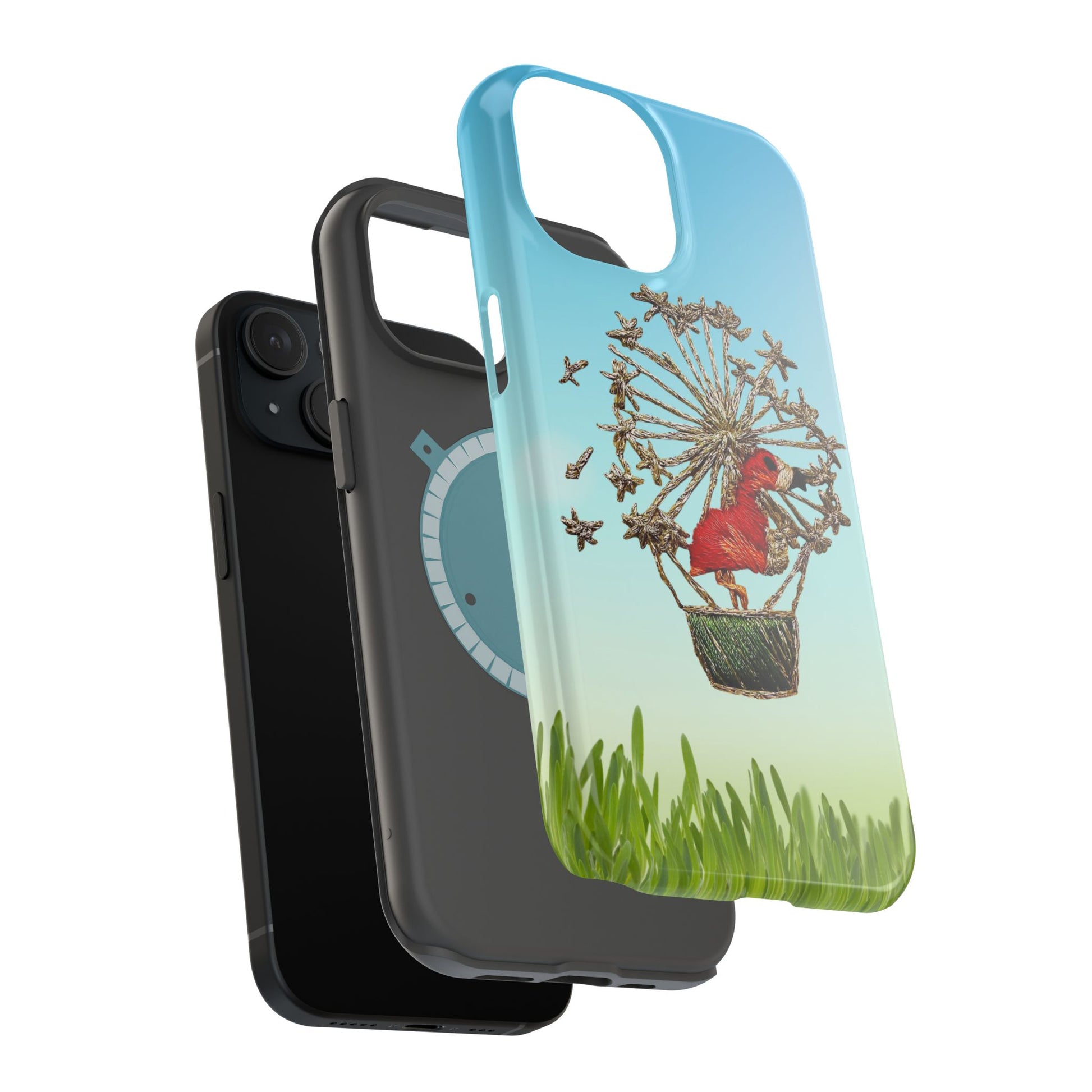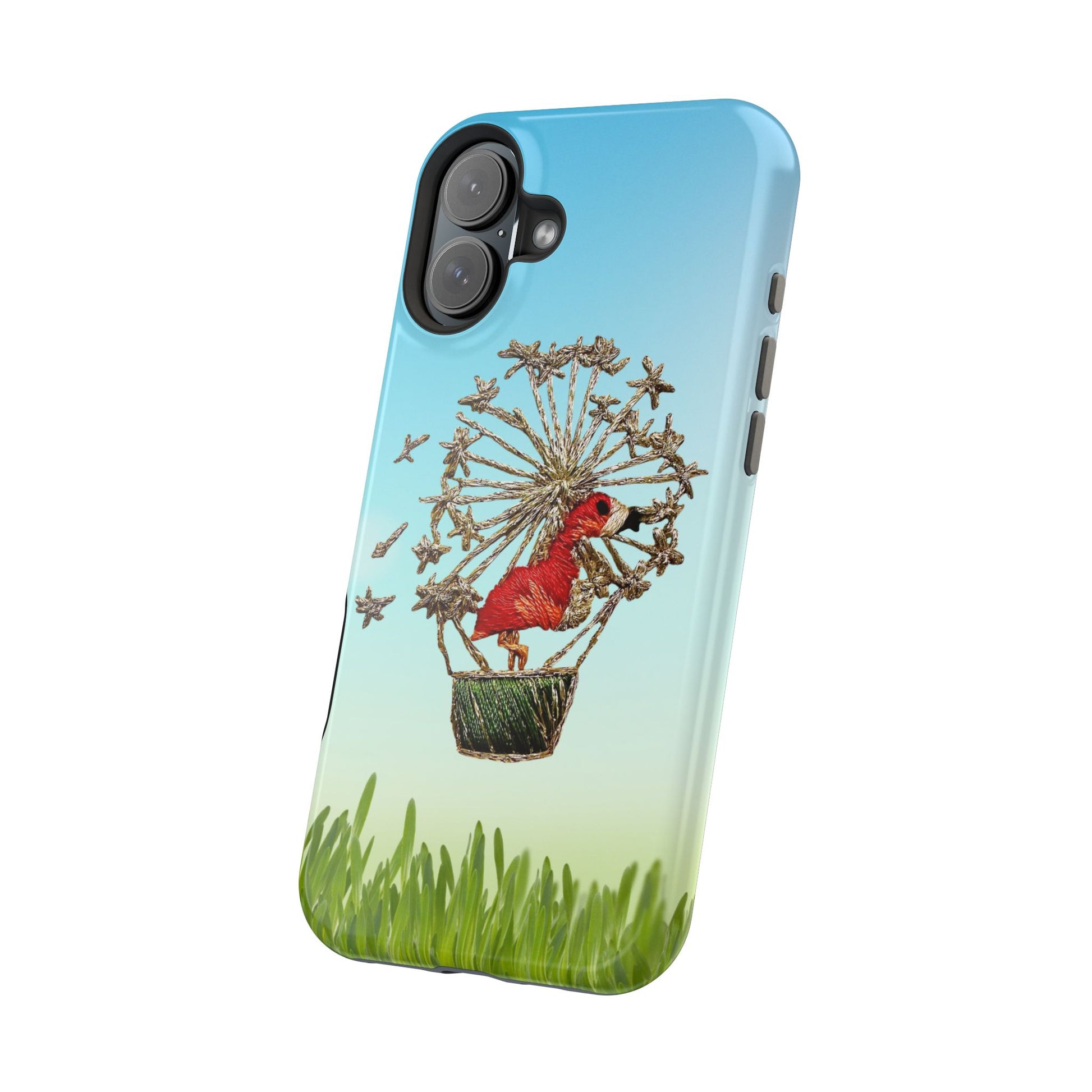 Protect your phone in style with this magnetic phone case featuring a sunny day blue sky background with a digital image of an embroidered dandelion hot air balloon with a flamingo. The vibrant colors and dual-layer polycarbonate construction provide durability and protection. Perfect for those who love unique and whimsical designs, this phone case is great for adding a pop of color to your everyday life. Ideal for birthdays, holidays, or any special occasion.