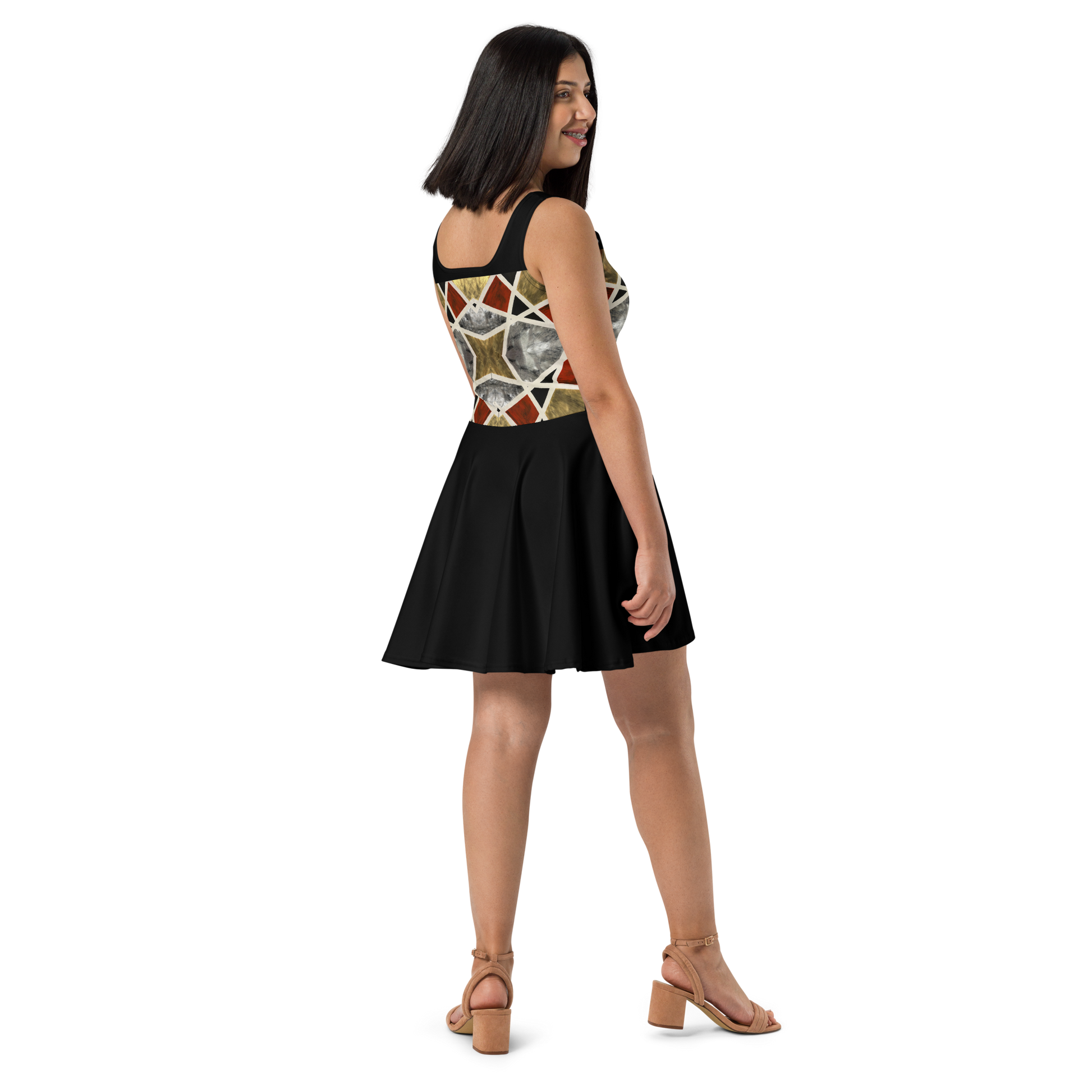 Embody strength and elegance with this stunning skater dress featuring the 'Elegance in Motion' painting print. The design, resembling armor, adds a touch of powerful sophistication to this flowy dress. Perfect for anyone who wants to make a statement with their fashion, this dress is both stylish and empowering. Handcrafted with love, it's a must-have for those who appreciate unique art-inspired clothing.