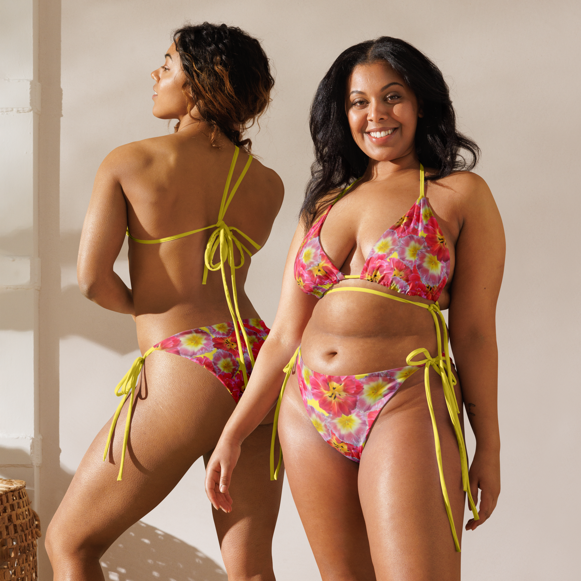 Dive into style with this stunning yellow string bikini featuring a vibrant pink flower collage created from my original photographs. The collage is carefully pieced together to bring you a unique and eye-catching design that adds a touch of nature's beauty to your beach look. Perfect for anyone who loves art-inspired swimwear and wants to make a splash this summer.